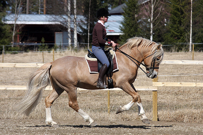 Taistelin pitkään koulutreeni ajatusta vastaan, mutta toisaalta päviän alkaessa lämmetä ja auringon paisteessa kylpevä sänkipelto suorastaan huusi minua ratsaille, päätin lakata estelemästä treeni-intoani ja varustin Arvan kankisuitsin valmiuteen. Ori tuntui vireältä jo talin pihassa, kun ei meinannut laseka minua selkään telineeltä. Hetken keskustelun jälkeen malttoi ori seisahtaa siksi aikaa että heilahdin ratsaille. Suuntasin orin turvan kohti sänkipeltoa, mutta matkalla pellolle kävelimme tarhojen ohitse ja Sergei sai hepulit toisesta orista. Arpa reagoi myös mylvivään tarhailijaan ja tepsutteli korkeaa paikallaan polkevaa ravin ja laukan sekoitusta. Pääsimme kuitenkin pellolle ehjinä ja siellä aloin kevennellä Arpaa ensin rennoksi eteen alas ja laukassa avoimeen muotoon.