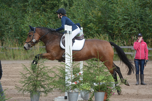 Kuitenkin Hilla kulki nätisti jo kuolaintuntumalla kaikisa askellajeissa, eikä välittänyt vaikka istuin kevyessäistunnassa ja annoin selälle vapaan liikkuma tilan. Ensimmäiset yhteiset hyppymme olivat hieman hapuilevia, mutta muuten se kuitenkin toimi hyvin. Hilla ei taistellut vastaan hypyissä, mutta tasapainottomuuttaan tukeutui aika vahvasti ohjaan ja esteen jälkeen se oli todela etupainotteinen. Lisäsin esteen perään puomin, jotta Hilla olisi nopeammin omilla jaloillaan. Esteet oli pieniä, mutta harjoittelu oli juuri oikeaa Hillan kaltaiselle nuorelle hevoselle. Otin lähestymisiä myös ravissa, joiden jälkeen tamma oli paljon paremmassa tasapainossa hypyn jälkeen.
