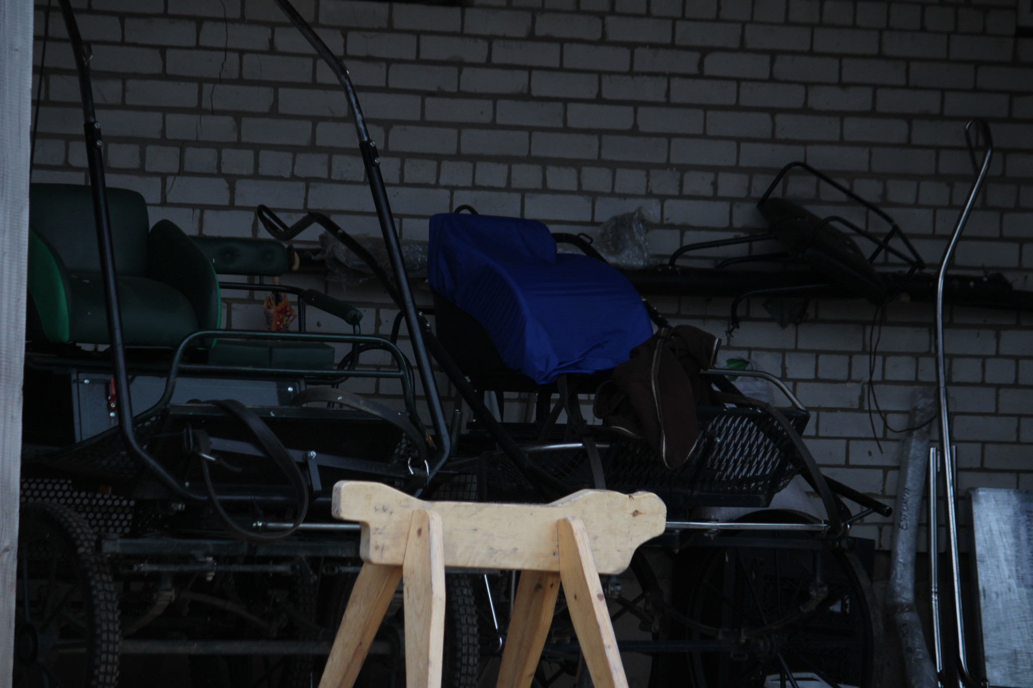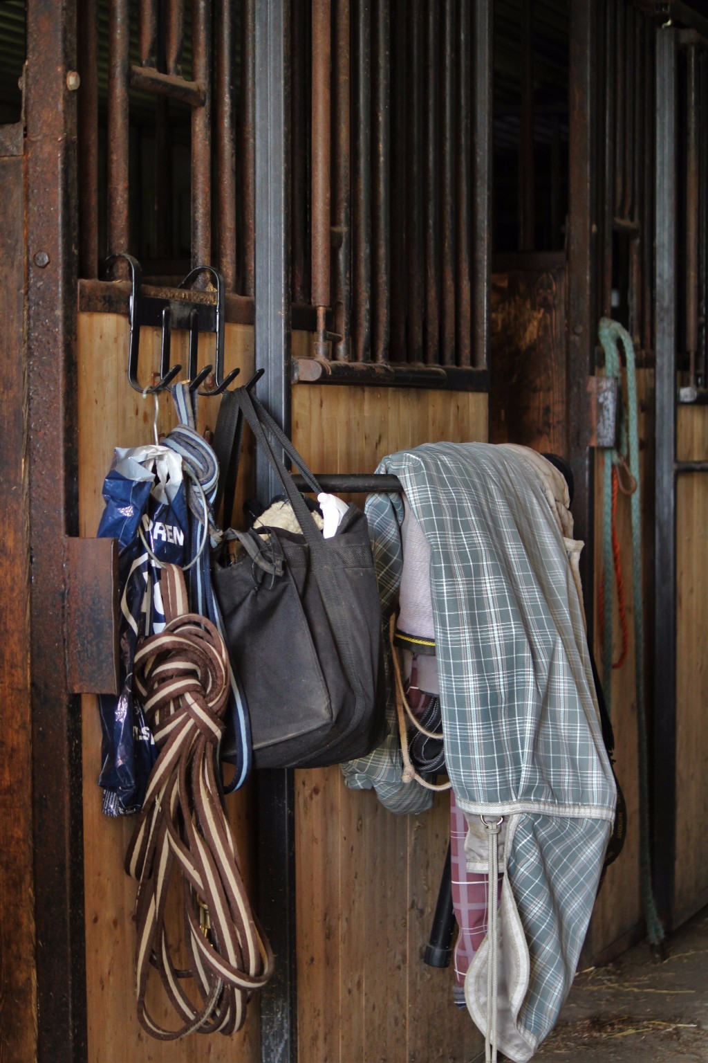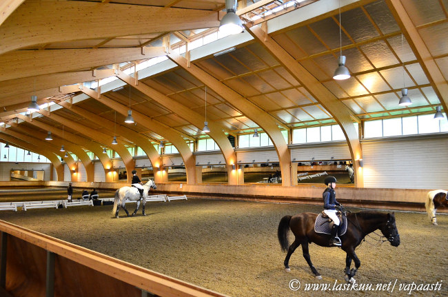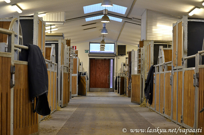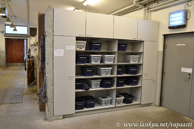 Yksityisille on varattu tuo tallin vanhin osuus, eli hirsitalli. Tallissa on kuusi tilavaa karsinaa, joissa on tarvittavat mukavuudet. Mikä hirsitallista tekee kivan on tosiaan tunnelmallinen, mutta todella tilavan käytävän omaava oma yksikkönsä. Se on yhteydessä päätalliin, mutta sinne on tuntiratsastajilta pääsy kielletty. Kuivaushuoneista pinempi on kokonana yksityisten valtakuntaa ja siellä on myös säilytystilaa. Eniten säilytystilaa löytyy kuitenkin varustehuoneesta ja käytävältä. Käytävällä pesukarsinan vieressä on kaikille omat pystykaapit joissa on hyvä säilyttää muutama vaihtoloimi, varariimu ja hevosen rehut on tarkoitus myös säilyttää näissä kaapeissa. Muut varusteet saa näppärästi varustehuoneen isoihin kaappeihin ja ylimääräisiin telineisiin. Käytävällä on tilaa myös omalle kisakaapille, jos sellaisen omistaa.