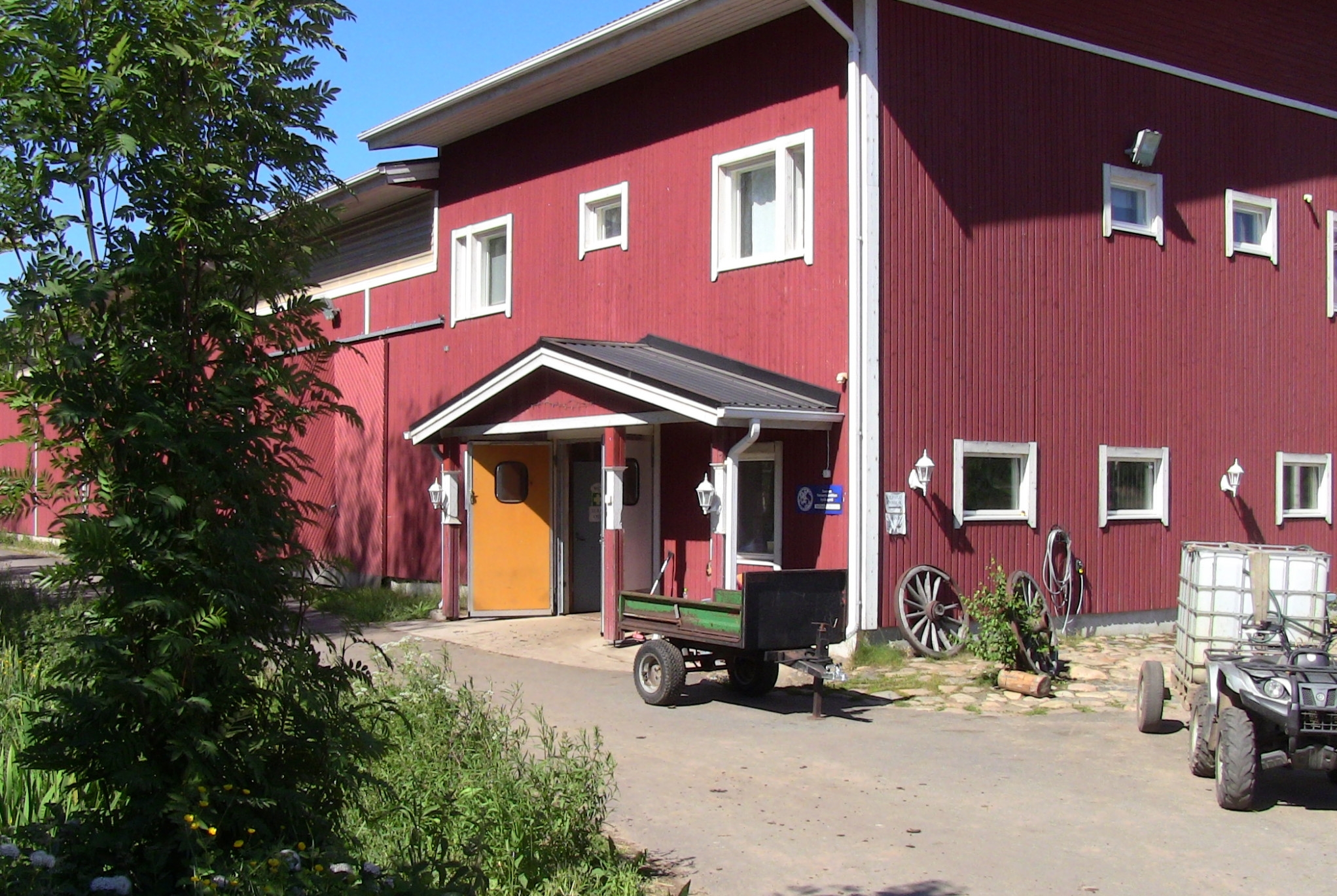 Päätalli on rakennettu osittain hirrestä ja osittain paremmin eristetystä kivielementistä, totesimme kun kuulimme että vanha hirsitallin pätkä on myynnissä että sehn olisi kiva ja tilan päätallia päätettiin myös koristaa hirsillä, mutta toki kuitenkin hyvin eristettynä. Talli pysyy talvellakin miellyttävän lämpimänä ja kesällä sopivan viileänä, kun tallissa on tehokas ilmastointi, jolla voi säädellä tallin lämpötilaa konehuoneesta käsin. Pää ovista kun tulee sisään niin vasemmalle jatkuu varastoa ja oven vierestä löytyy heti WC ja varustehuone. Oikealta puolelta pääsee kapuamaan rappusia pitkin yläkertaan ja rappusten alta löytyy kaappitilaa, sekä ns minikeittiö, jossa hevosten ruuat turvotetaan ja jaetaan. Yläkerrasta löytyy toimisto, oleskelutila, joka on varustettu kattavalla keittiöllä, lisäksi yläkerrasta löytyy pesula ja kuivaushuone (johon ei tuoda likasia loimia kuivumaan).